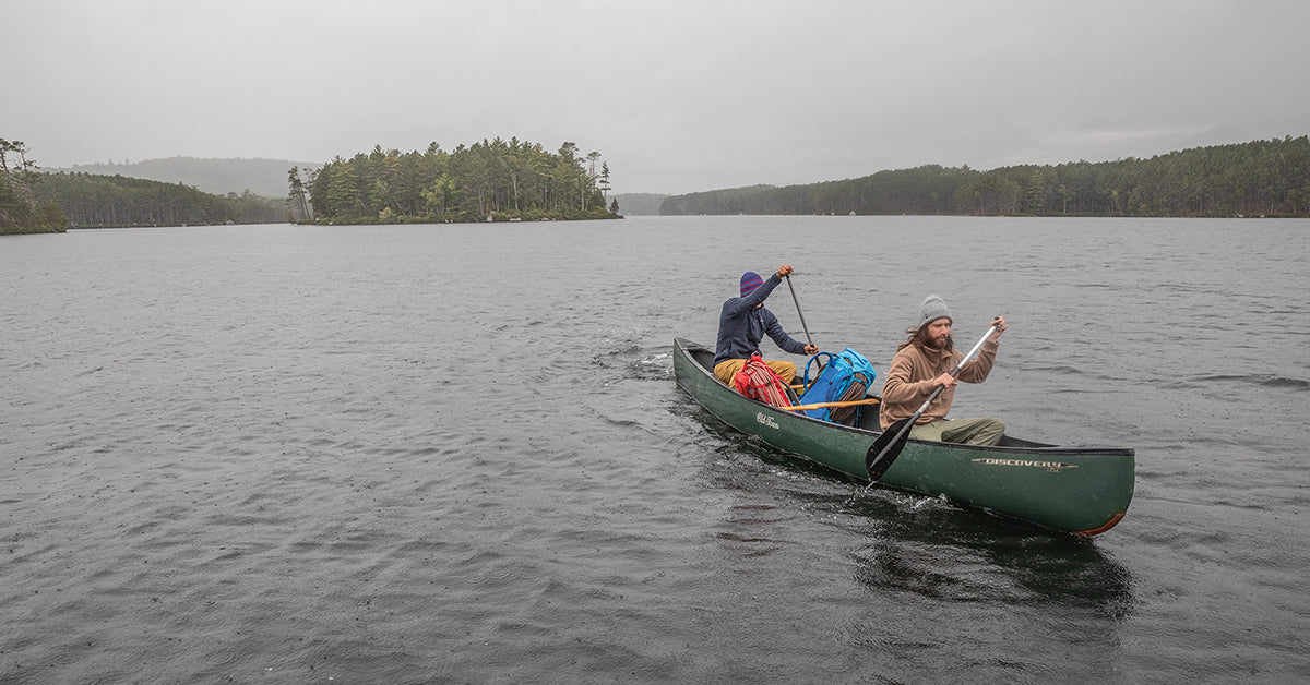 Los días nublados van mejor con el viento de proa (y con los amigos, para que te ayuden a remar más rápido). Ty Marshall y Teancum Bryant hacen lo mejor que pueden en Upper Togue Pond, en Baxter State Park de Maine. Foto: Andrew Burr